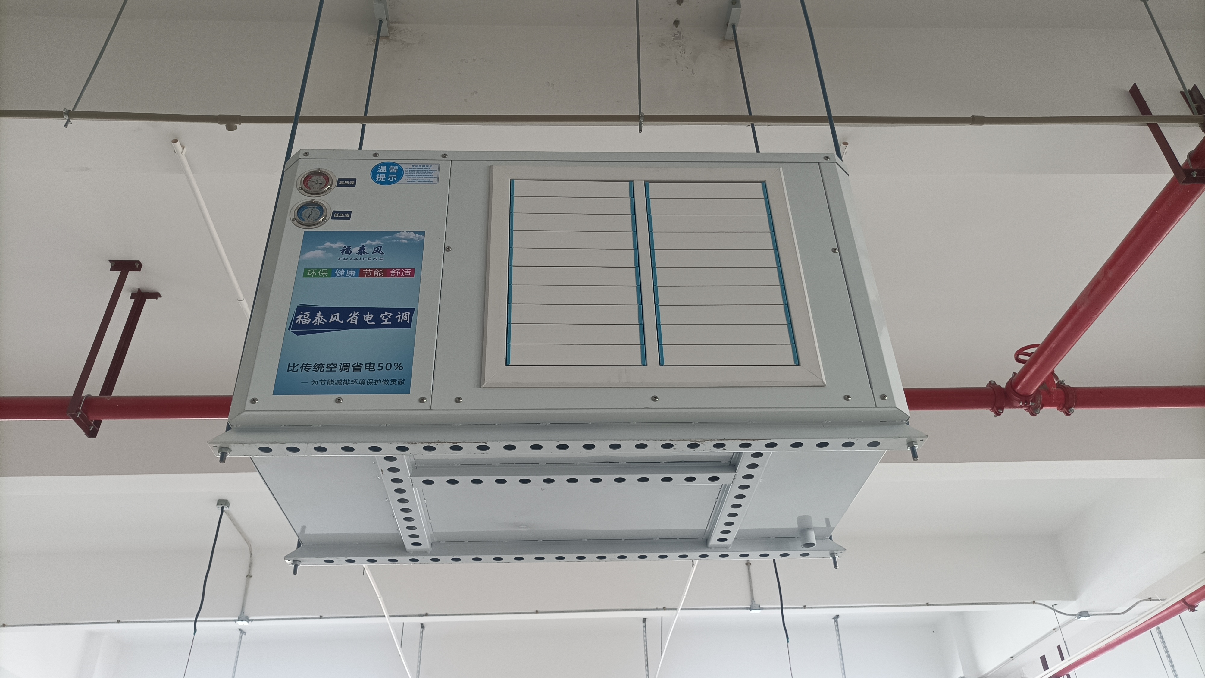 福泰蒸发冷空调为什么省电,因为蒸发冷空调是靠水冷来降温的,节省了对压缩机的能耗,提高了能效,所以说它比传统空调可以节省30%-40%的电,对于工厂来说,风量大,送风源又省电费,这样才是适合他们工厂降温的一个方式。传统空调一台五匹,它的覆盖面积是60到80个平方,而蒸发冷空调一台五匹的话,它是200左右的覆盖面积,所以说现在越来越多的厂房降温都在选择这种蒸发冷空调了。